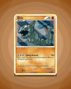 Onix from the HS Unleashed set is a Common card numbered 57. It features 90 HP and a single attack called Swing Around. This straightforward design highlights Onix’s rugged nature in battle.