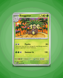 Exeggutor from the 151 set is an uncommon card with a solid 140 HP. It features the attack Hammer In, providing straightforward offensive capability. This card holds a unique spot in the collection as number 103.