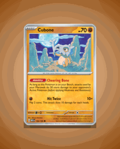 Cubone from the 151 set is a common card featuring 70 HP. It has the ability Cheering Bone and a straightforward attack called Hit Twice. This card is number 104 in the set.