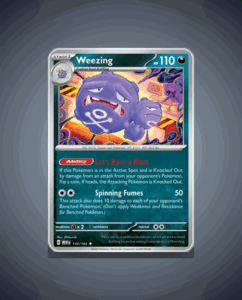 Weezing from the 151 set is a Rare card boasting 110 HP. Its ability, Let’s Have a Blast, adds strategic depth, while the attack Spinning Fumes offers a dynamic offensive option. This card stands out with its solid stats and unique moves.