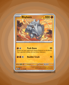 Rhyhorn is a Common card from the 151 set, numbered 111. It features a sturdy 100 HP and the powerful attack Boulder Crush. This card offers a solid presence for collectors seeking classic Pokémon.