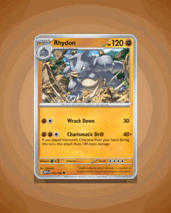 Rhydon from the 151 set is an uncommon card featuring a solid 120 HP. This sturdy Pokémon boasts the attack Charismatic Drill, adding a distinctive edge to its battle capabilities. Its presence in the set offers collectors a robust and memorable addition.