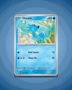 Horsea is a common Pokémon card from the 151 set, numbered 116. It has 60 HP and features the attack Sharp Fin. This card offers a straightforward addition to any collection.