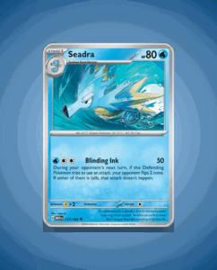 Seadra from the 151 set is an uncommon card with 80 HP. It features the distinctive attack Blinding Ink, adding a strategic edge in battle. This sleek aquatic Pokémon stands out in any collection.