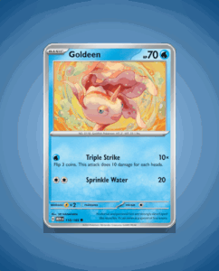 Goldeen is a Common card from the 151 set, numbered 118. It has 70 HP and features the attack Sprinkle Water. This card offers a straightforward, aquatic-themed addition to any collection.