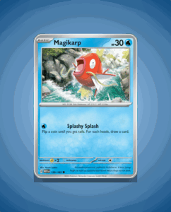 Magikarp from the 151 set is a common card featuring 30 HP. Its sole attack, Splashy Splash, reflects the character’s simple yet iconic nature. This card holds a modest place in any collection due to its straightforward design.