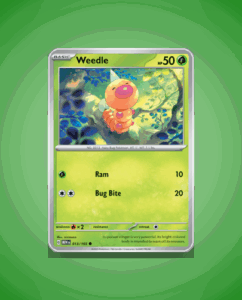 Weedle is a common Pokémon card from the 151 set, numbered 13. It has 50 HP and features the attack Bug Bite. This modest card captures the early stages of a classic Bug-type Pokémon.