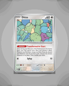 Ditto from the 151 set is a rare card featuring 60 HP. It boasts the unique ability “Transformative Start” and the attack “Splup.” This card offers an intriguing addition for collectors seeking distinctive gameplay elements.