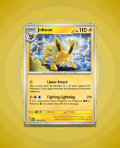 Jolteon from the 151 set is a Rare card featuring 110 HP. This energetic Pokémon is known for its attack called Fighting Lightning. It holds the number 135 in the set, making it a distinctive addition for collectors.