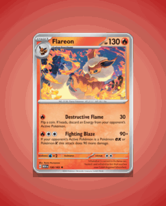 Flareon is a Rare card from the 151 set, numbered 136. It boasts a vibrant 130 HP, making it a sturdy addition to any deck. Its sole attack, Fighting Blaze, offers a focused offensive option. This card’s design captures Flareon’s fiery essence with striking detail.