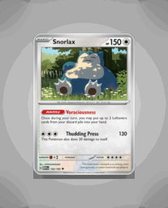 Snorlax from the 151 set is an uncommon card with a hefty 150 HP. It features the ability Voraciousness and the attack Thudding Press. This sturdy Pokémon stands out with its solid stats and reliable moves.