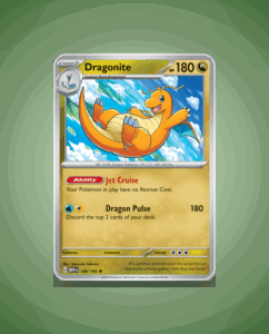 Dragonite from the 151 set is a rare card boasting 180 HP. Its ability, Jet Cruise, adds a strategic edge, while the Dragon Pulse attack delivers solid damage. Numbered 149, this card stands out in any collection.