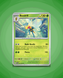 Beedrill from the 151 set is a Rare card featuring 130 HP. This agile Pokémon is known for its sharp attack, Pierce. It holds the number 15 in the set, making it a notable addition for collectors.