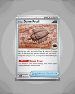 Antique Dome Fossil from the 151 set is a common card numbered 152. It features 60 HP and the ability Domed Armor, offering a unique defensive trait. This card’s design captures the essence of ancient Pokémon fossils with a classic touch.
