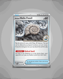 Antique Helix Fossil is a Common card from the 151 set, numbered 153. It features a modest 60 HP and the unique ability Helical Swell. This card offers a distinctive glimpse into the classic elements of the Pokémon TCG.