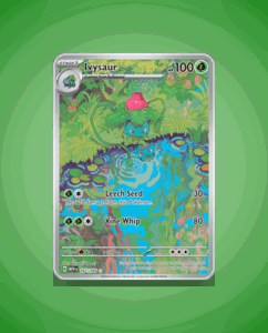 Ivysaur from the 151 set is a striking Illustration Rare card, numbered 167. It boasts 100 HP and features the dynamic attack Vine Whip. This card’s vivid artwork makes it a notable piece for collectors.