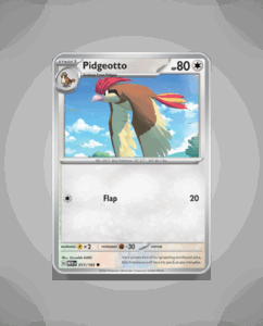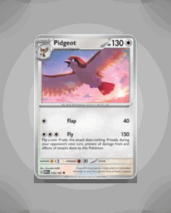 Pidgeot from the 151 set is an uncommon card featuring 130 HP, making it a sturdy choice in battle. This card showcases the classic attack Fly, embodying the swift and graceful nature of the Pokémon. Its vibrant design captures Pidgeot’s dynamic presence in the game.