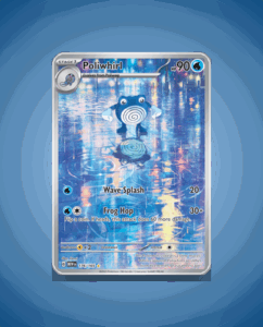 Poliwhirl from the 151 set is a striking Illustration Rare card featuring 90 HP. This card showcases the dynamic attack Frog Hop, adding a lively touch to gameplay. Numbered 176, it stands out as a vivid piece for collectors.