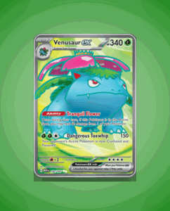Venusaur ex from the 151 set is an Ultra Rare card boasting a robust 340 HP. It features the distinctive ability Tranquil Flower and the striking attack Dangerous Toxwhip. This card stands out with its impressive stats and unique move set.