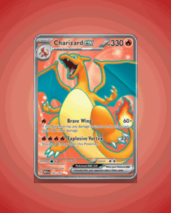 Charizard ex from the 151 set is an Ultra Rare card boasting a striking 330 HP. This powerful Pokémon features the dynamic attack Explosive Vortex, making it a notable addition for collectors. Numbered 183, it stands out with its impressive stats and design.