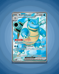 Blastoise ex from the 151 set is an Ultra Rare card boasting a robust 330 HP. It features the Solid Shell ability, enhancing its defensive capabilities. Its powerful attack, Twin Cannons, adds a strategic edge in battle. This card is numbered 184 in the set.