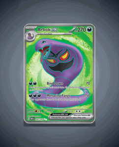 Arbok ex from the 151 set is an Ultra Rare card featuring a striking 270 HP. This powerful Pokémon showcases the attack Menacing Fangs, emphasizing its fierce battle style. Numbered 185, it stands out as a notable addition for collectors.