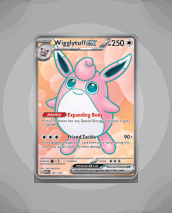 Wigglytuff ex from the 151 set is an Ultra Rare card boasting a hefty 250 HP. Its Expanding Body ability offers strategic value, while the Friend Tackle attack adds a dynamic edge. This card’s vibrant presence makes it a notable addition for collectors.