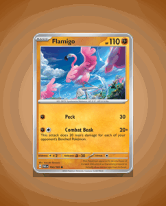 Flamigo is a Common Pokémon card from the Paradox Rift set, numbered 106. It has 110 HP and features the attack Peck. This card offers a straightforward yet engaging addition to any collection.