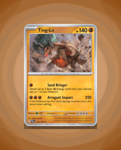 Ting-Lu is a Rare card from the Paradox Rift set, numbered 109. It boasts 140 HP and features the striking attack Arrogant Impact. This card offers a solid presence for collectors seeking distinctive Pokémon from the set.