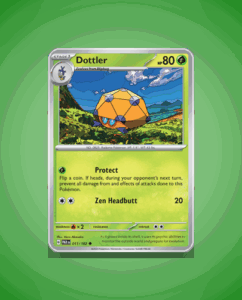Dottler from the Paradox Rift set is a common card numbered 11 with 80 HP. This Pokémon features the attack Zen Headbutt, offering a straightforward option for gameplay. Its design and stats make it a solid choice for collectors focusing on this set.