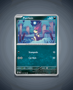 Purrloin is a Common Pokémon card from the Paradox Rift set, numbered 114. It has 60 HP and features the attack Cat Kick. This sleek card offers a straightforward addition to any collection.