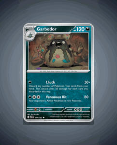Garbodor from the Paradox Rift set is an uncommon card with 120 HP. It features the attack Venomous Hit, adding a strategic edge to gameplay. This card is numbered 117 in the set.