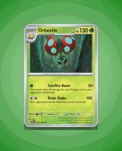 Orbeetle is an Uncommon card from the Paradox Rift set, numbered 12. It boasts a solid 130 HP and features the intriguing attack Brain Shake. This card offers a balanced addition to any collection with its distinctive design and gameplay potential.