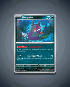 Morpeko from the Paradox Rift set is a rare card with 70 HP. It features the ability In a Hungry Hurry and the attack Energizer Wheel. This card is numbered 121 in the set.