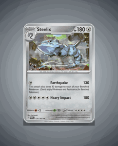 Steelix from the Paradox Rift set is a rare card numbered 125. It boasts a sturdy 180 HP, making it a resilient choice in battle. Its attack, Heavy Impact, delivers a powerful strike to opponents. This card’s design captures Steelix’s imposing presence with vivid detail.