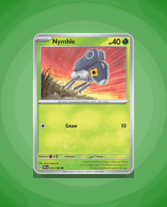 Nymble is a Common Pokémon card from the Paradox Rift set, numbered 13. It has a modest 40 HP and features the attack Gnaw. This card offers a straightforward addition to any collection.