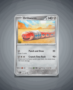 Orthworm is an Uncommon card from the Paradox Rift set, numbered 138. It features a solid 140 HP, making it a sturdy addition to any deck. This card includes the distinctive attack Crunch-Time Rush, adding strategic value during battles.