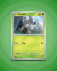 Nymble is a Common Pokémon card from the Paradox Rift set, numbered 14. It has a modest 50 HP and features the attack Flop. This card offers a straightforward addition to any collection.