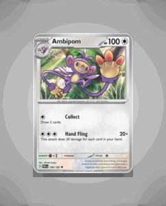 Ambipom from the Paradox Rift set is an uncommon Pokémon card with 100 HP. It features the distinctive attack Hand Fling, adding strategic variety to gameplay. This card is numbered 146 in the set.