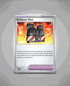 Defiance Vest is an Uncommon Trainer card from the Paradox Rift set, numbered 162. Its design reflects the set’s dynamic theme, adding strategic depth to gameplay. Collectors will find it a notable piece within the Paradox Rift lineup.