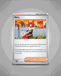 Mela is an uncommon card from the Paradox Rift set, numbered 167. This character adds a unique presence to any collection with its distinct design. Its rarity makes it a notable find for enthusiasts exploring this set.
