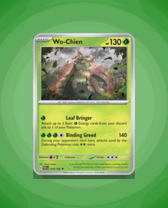 Wo-Chien is a rare Pokémon card from the Paradox Rift set, numbered 18. It features 130 HP and a distinctive attack called Binding Greed. This card offers a unique addition to any collection.