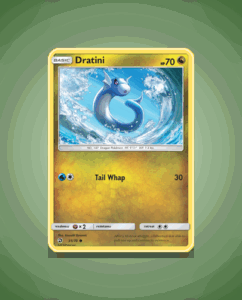 Dratini from the Dragon Majesty set is a common card numbered 35. It features a modest 70 HP and a single attack called Tail Whap. This card offers a straightforward addition to any Dragon-themed collection.