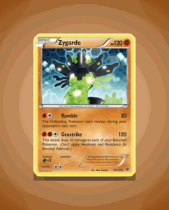 Zygarde from the Fates Collide set is a rare card numbered 53 with 120 HP. It features the striking attack Geostrike, adding strategic depth to gameplay. This Pokémon stands out with its solid stats and distinct presence in the set.