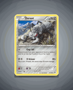 Durant from the Flashfire set is a rare card featuring 70 HP. This sleek Pokémon wields the attack X-Scissor, showcasing its sharp, cutting power. Number 61 in the set, Durant offers a focused and straightforward battle style.