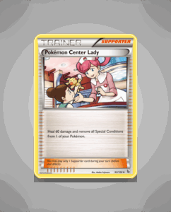 Pokémon Center Lady is an Uncommon card from the Flashfire set, numbered 93. This character card captures the helpful spirit of the Pokémon Center staff. Though it lacks attacks or abilities, it adds a charming touch to any collection.