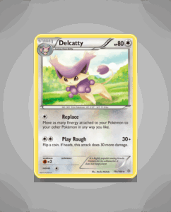 Delcatty from the Primal Clash set is a rare card numbered 114 with 80 HP. This sleek Pokémon features the attack Play Rough, offering a straightforward option in battle. Its design captures Delcatty’s graceful yet playful nature.