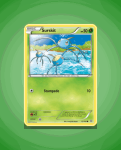 Surskit from the Primal Clash set is a common card numbered 13 with 50 HP. This agile Pokémon features the attack Stampede, making it a straightforward choice for quick plays. Its modest stats reflect its nimble nature in battle.
