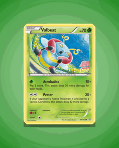 Volbeat from the Primal Clash set is a common Pokémon card numbered 17. It has a lively 70 HP and features the attack Pester. This card offers a straightforward addition to any collection.